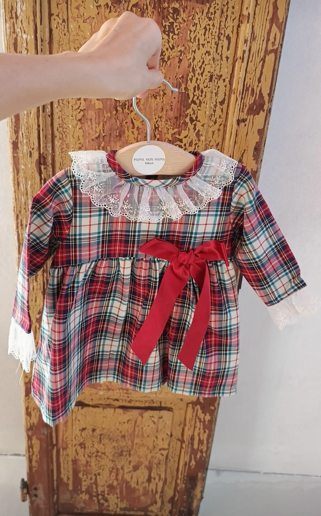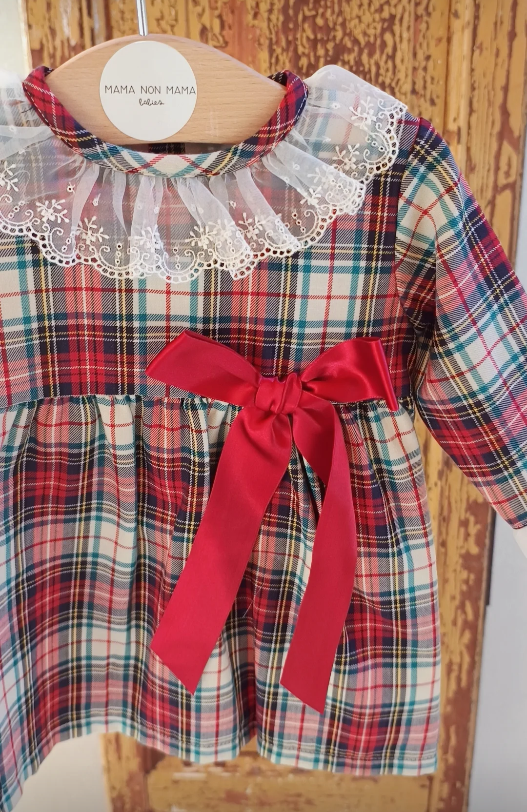 Abito con pizzo e fantasia tartan con fiocco raso in cotone 100%