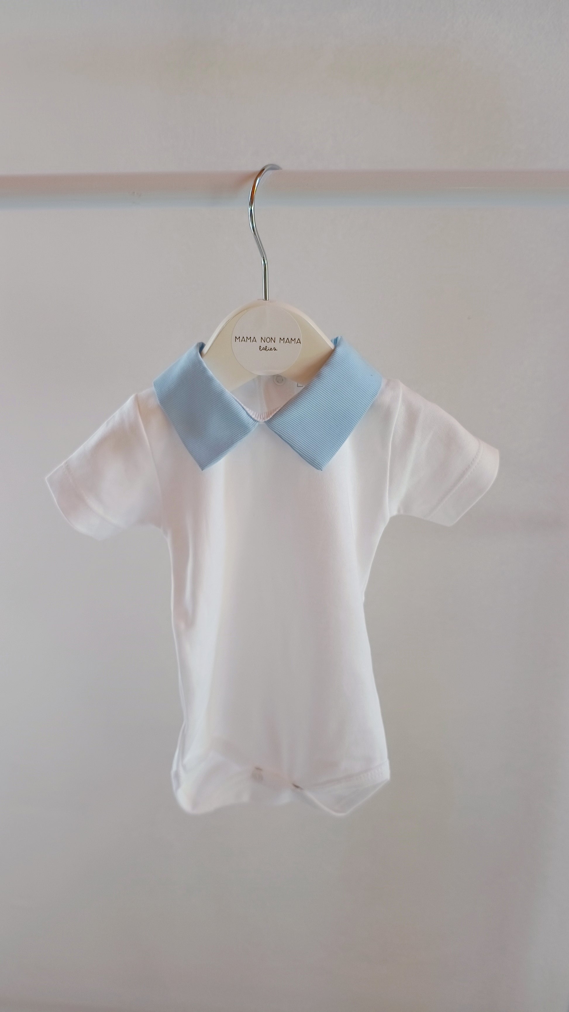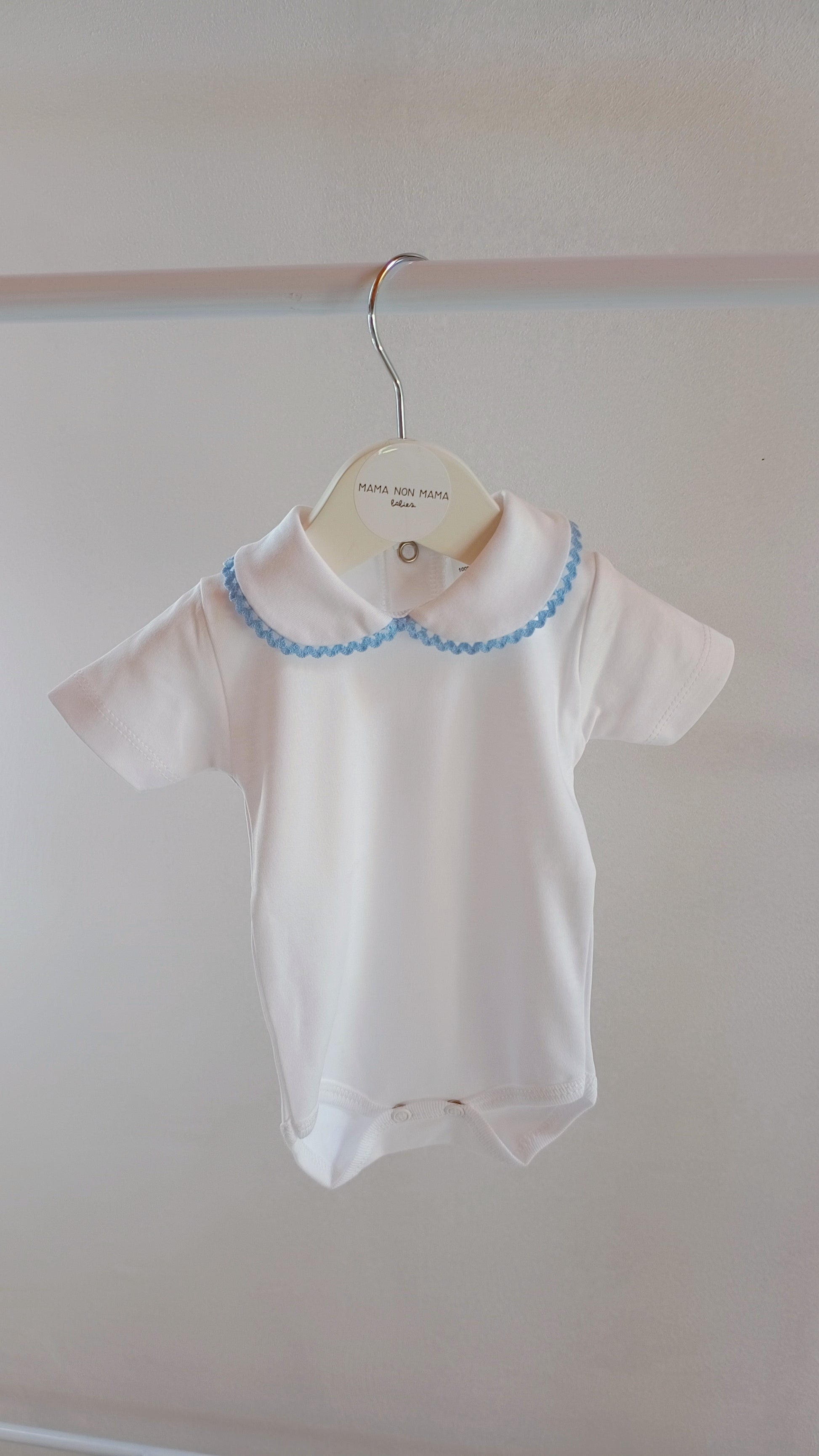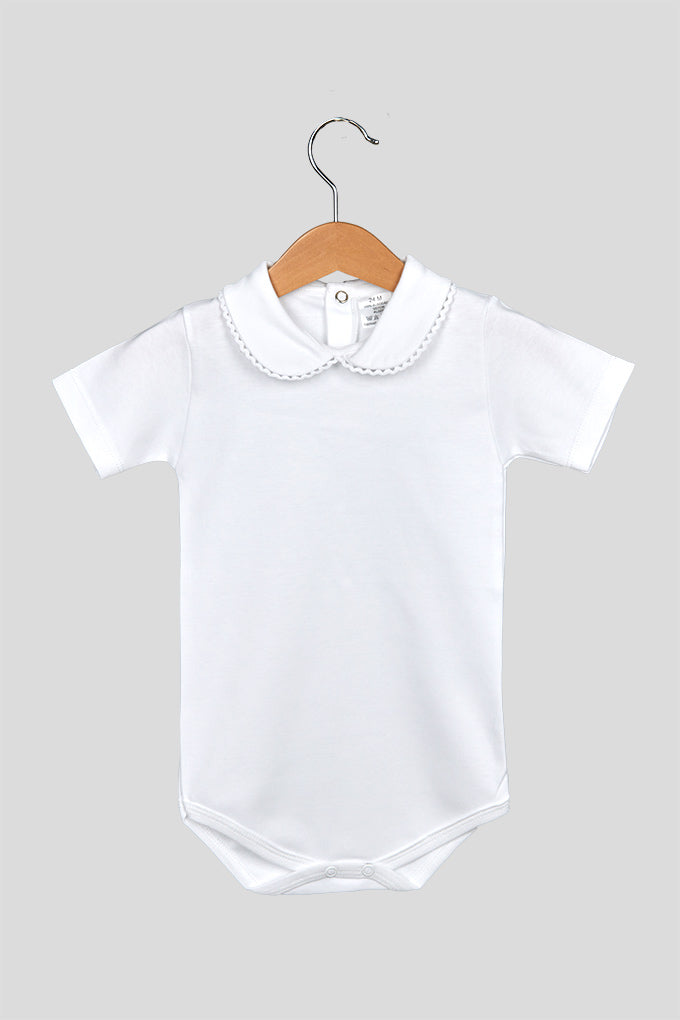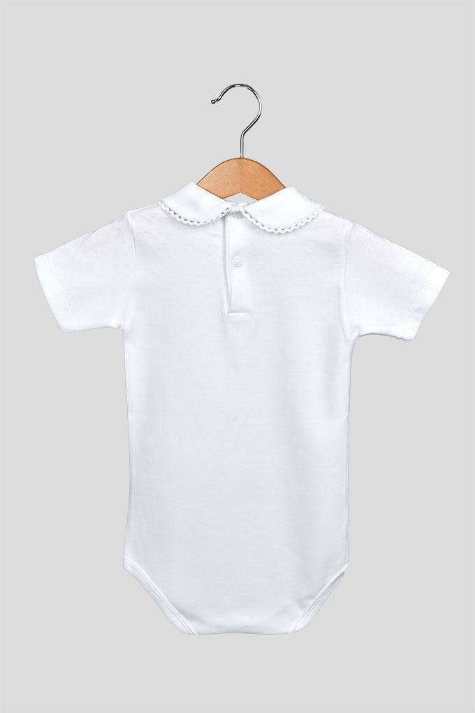 body neonato a maniche corte con colletto, in 100% cotone, con bottoncini sul retro e apertura per il cambio pannolino.
