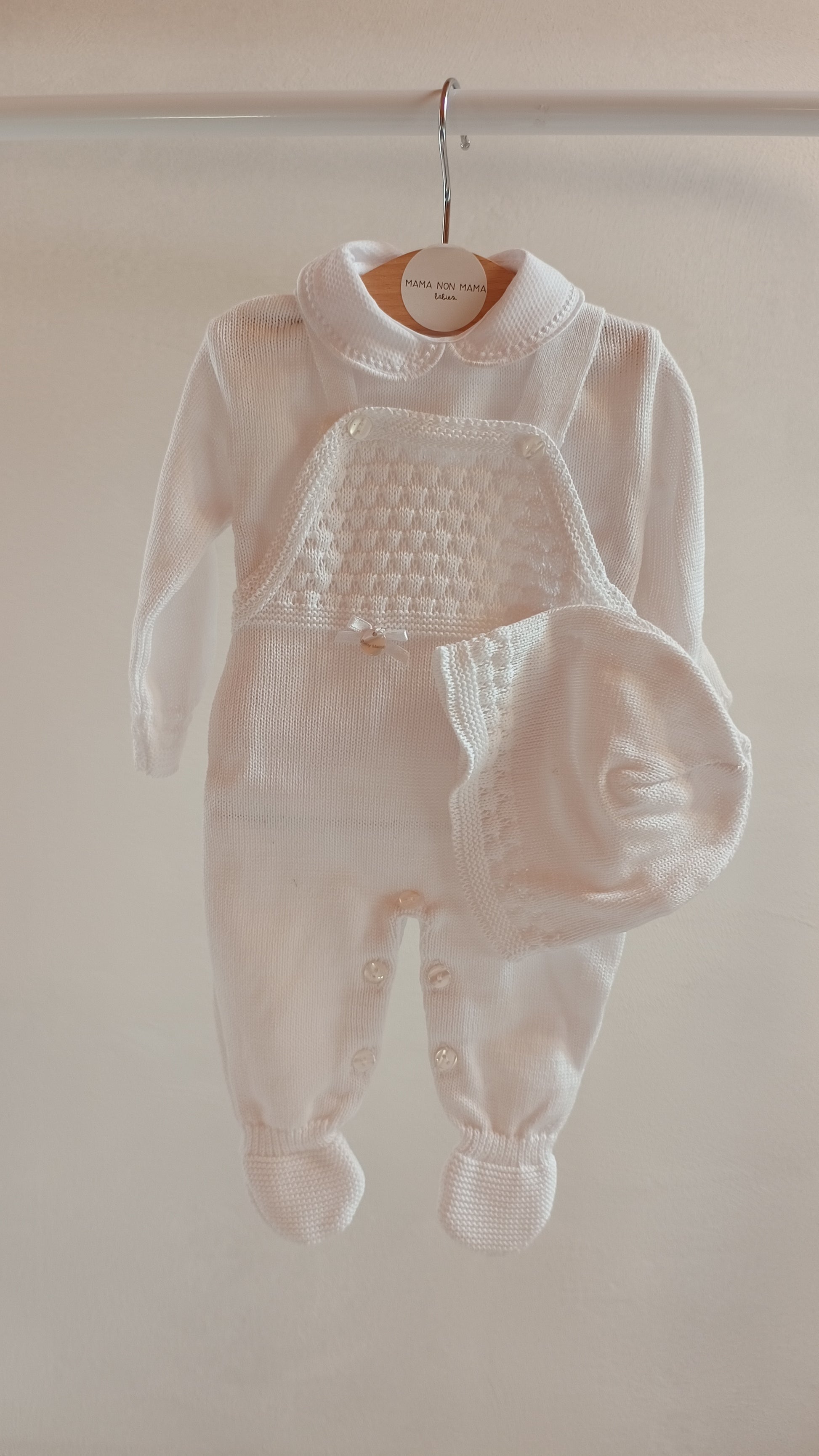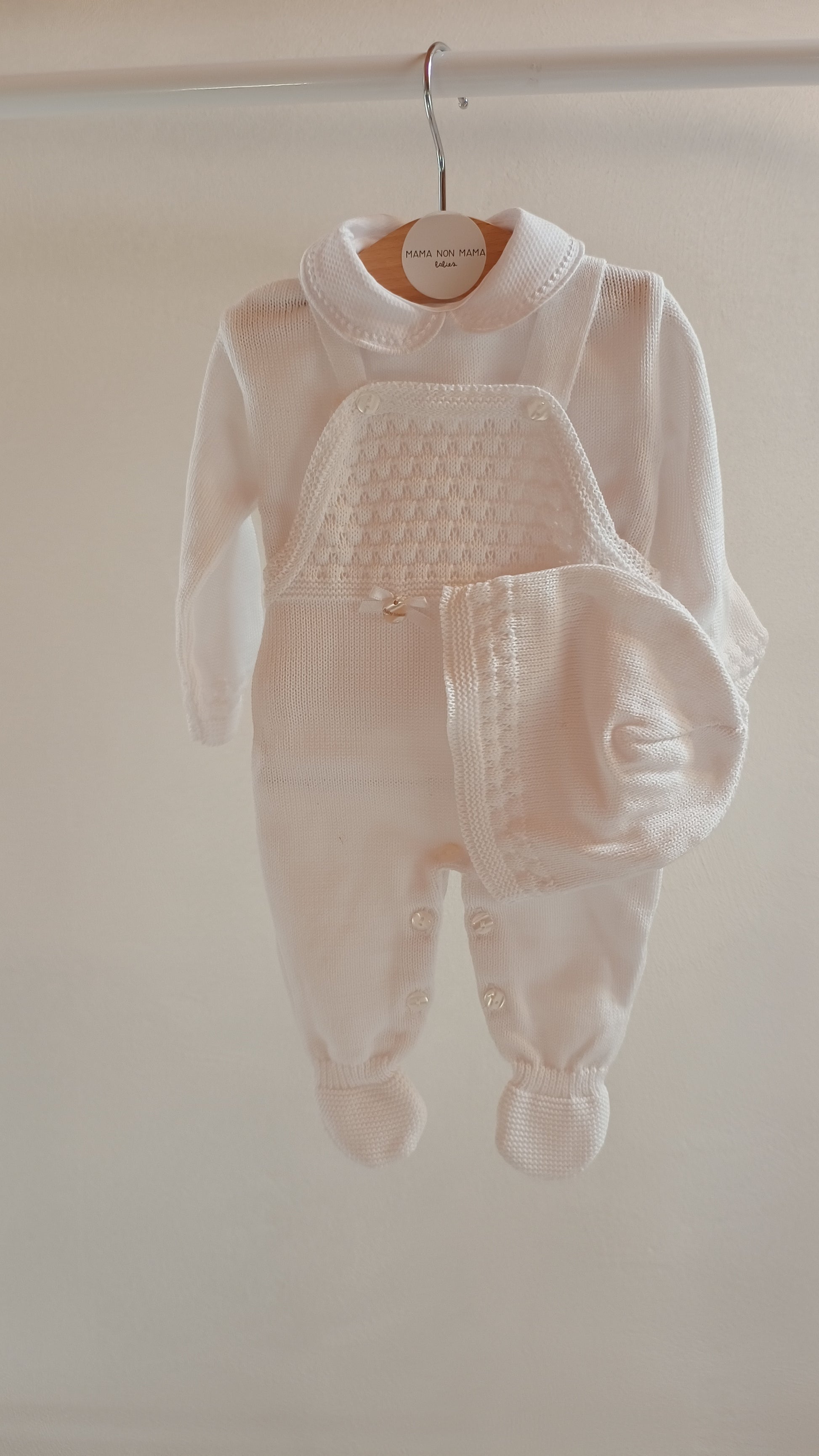* Cuffietta coordinata: Completa il look con una morbida cuffietta, ideale per proteggere la testolina del neonato dal freddo e garantirgli una temperatura corporea ottimale.
