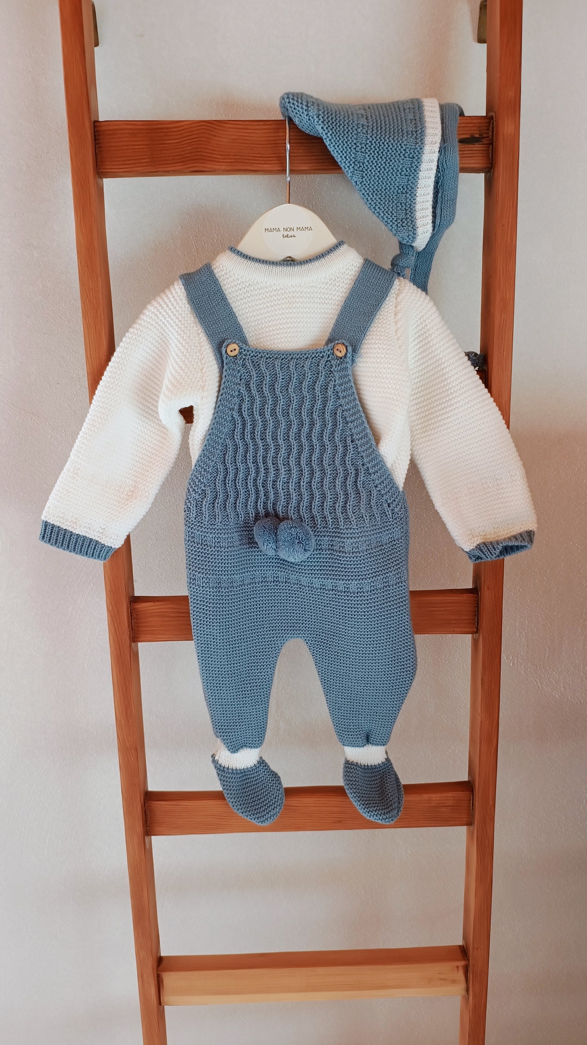 Avvolgi il tuo piccolo in una morbida nuvola di tenerezza con il nostro completo a 3 pezzi in maglia, perfetto per i primi mesi di vita. Disegnato per offrire il massimo comfort e calore, è l'outfit ideale per le prime uscite, i servizi fotografici e i momenti speciali.