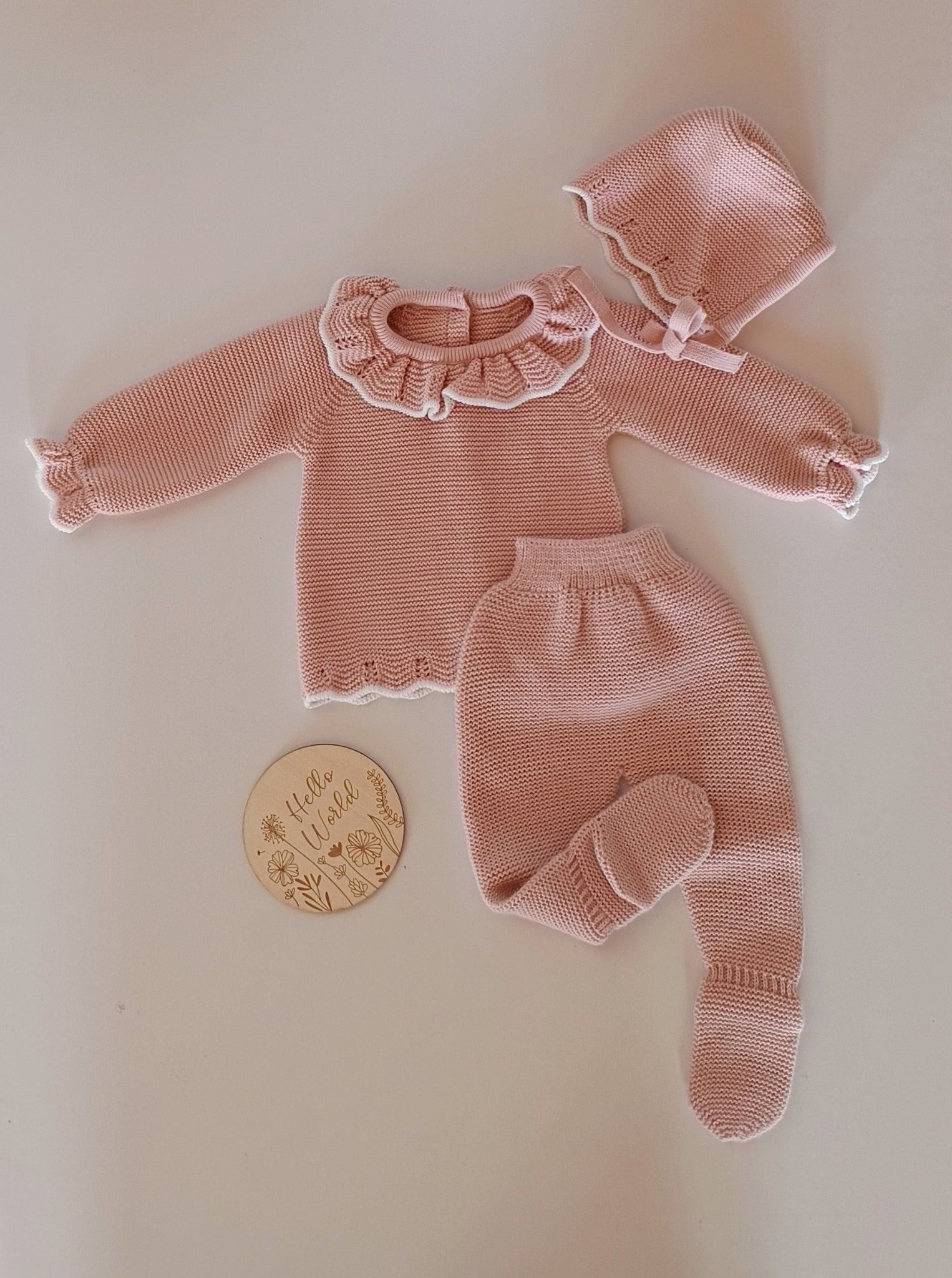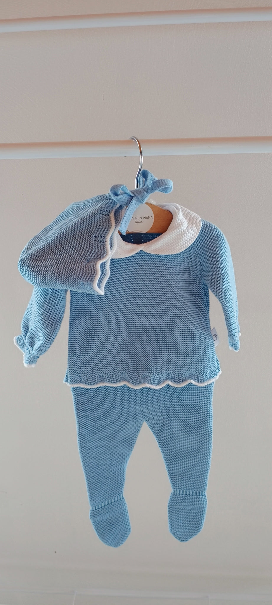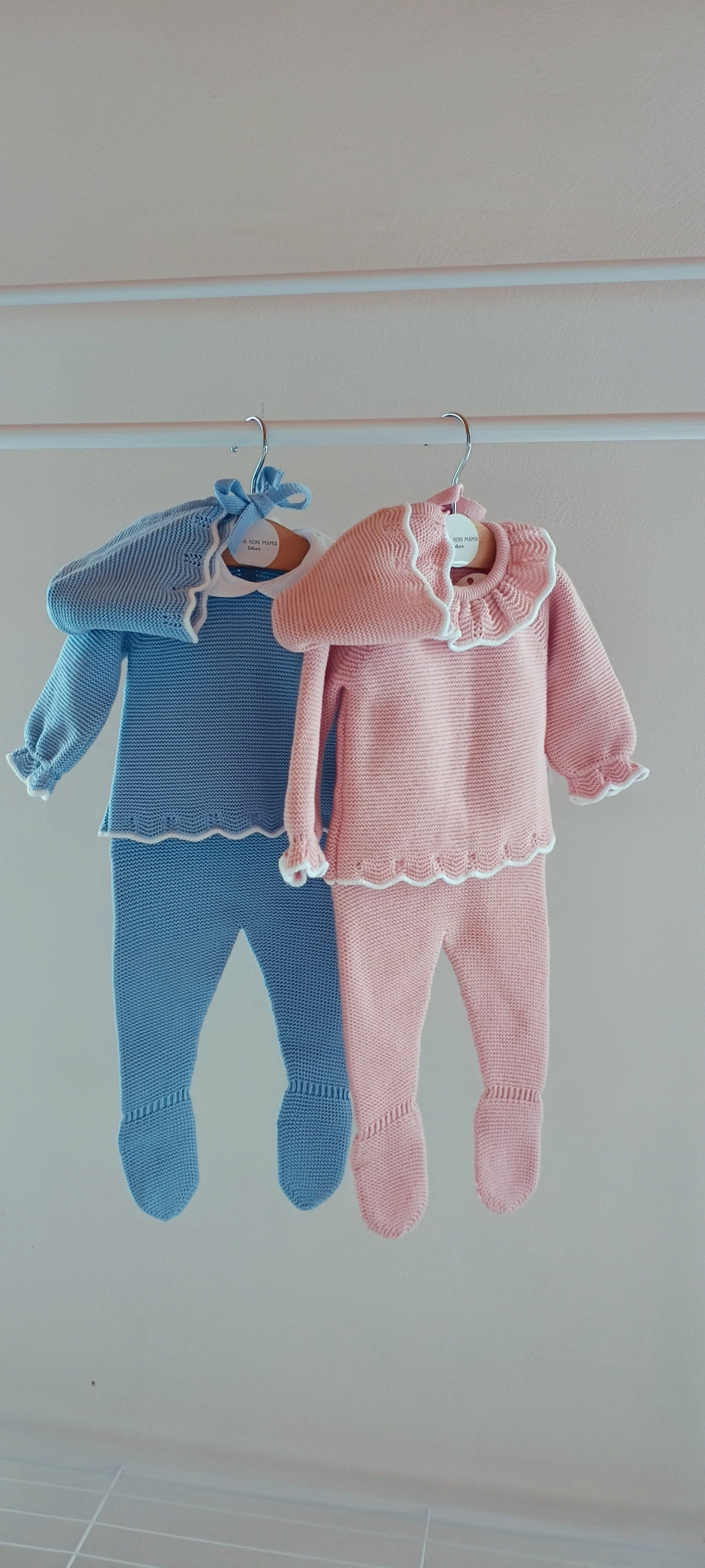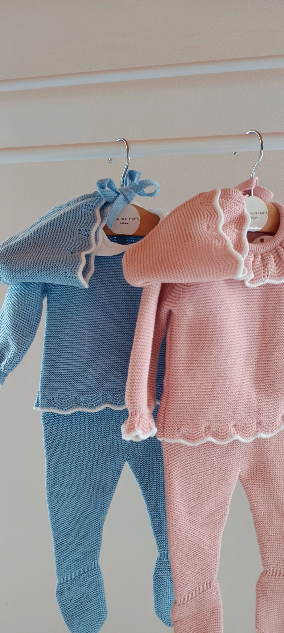 Il coordinato è disponibile in taglia unica (0-3 mesi) e nei colori rosa antico e azzurro.