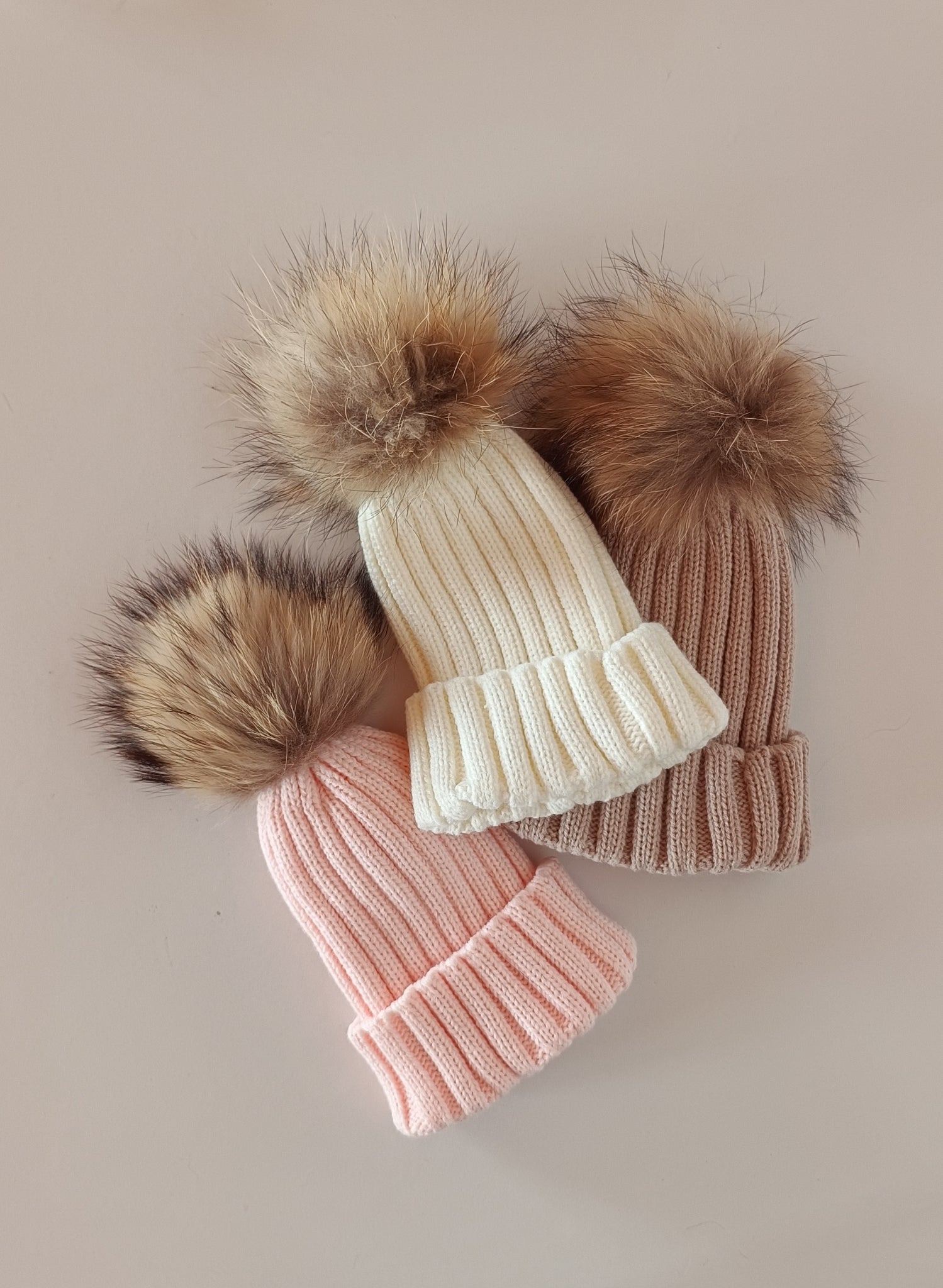 Cuffietta in caldo cotone con ponpon di vero pelo naturale