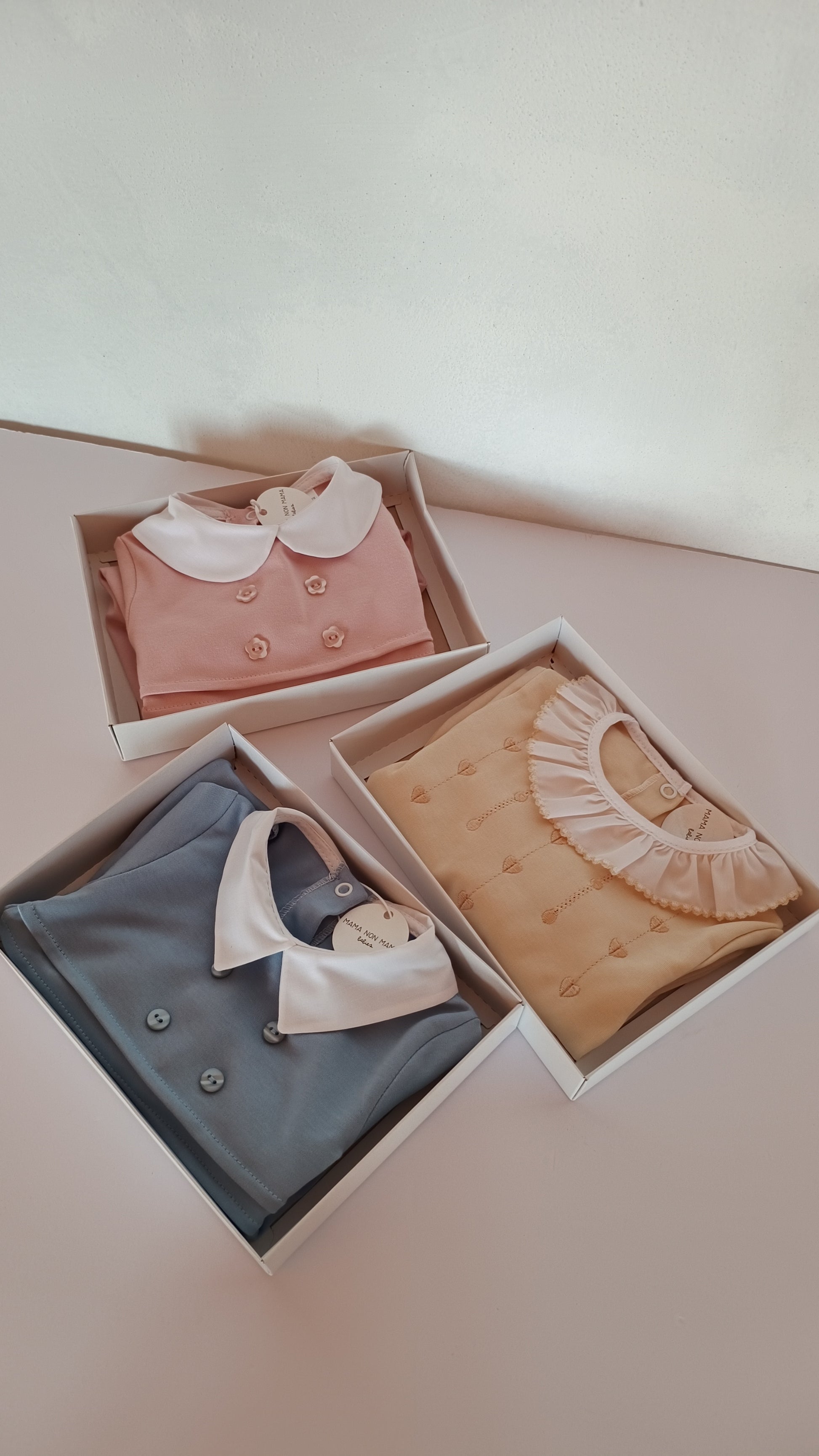 Prepara il corredino perfetto per il tuo neonato con questa dolcissima tutina con colletto, ideale per i primi giorni in clinica e per accogliere il tuo bambino con il massimo comfort. Realizzata interamente in 100% cotone di alta qualità, questa tutina è pensata per avvolgere la pelle delicata del neonato in una morbida carezza.