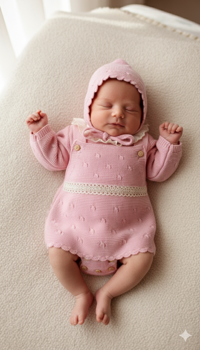 Un completo raffinato che unisce l'eleganza del design tradizionale alla praticità. Realizzato in finissima maglia tricot, questo set è composto da un pagliaccetto con spalline impreziosite da bottoni e un grazioso berretto con coulisse. Il punto traforato e il dettaglio in pizzo bianco sul colletto e sulla vita donano una sofisticazione senza tempo. Un capo essenziale e di lusso per il guardaroba del tuo neonato.