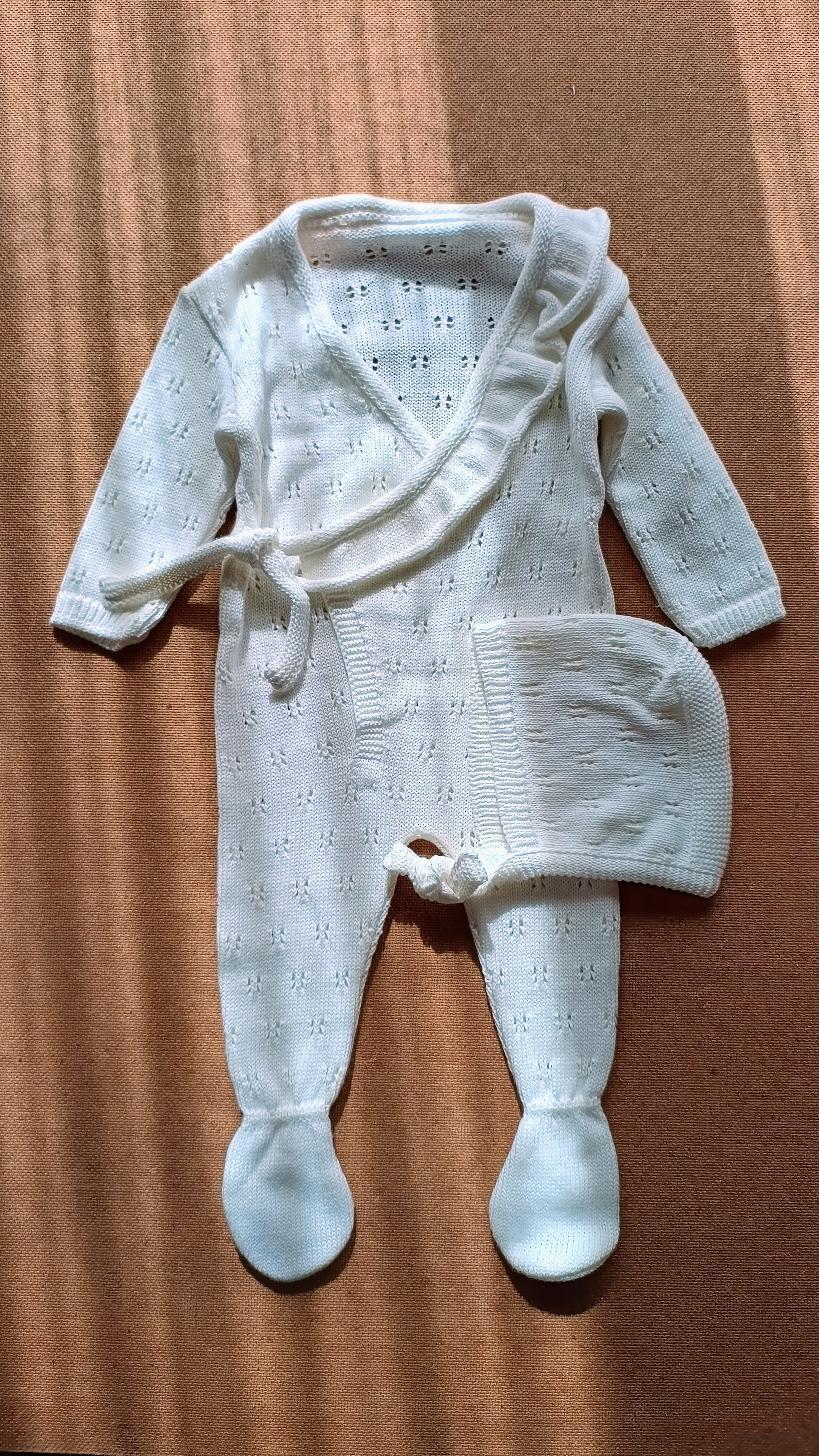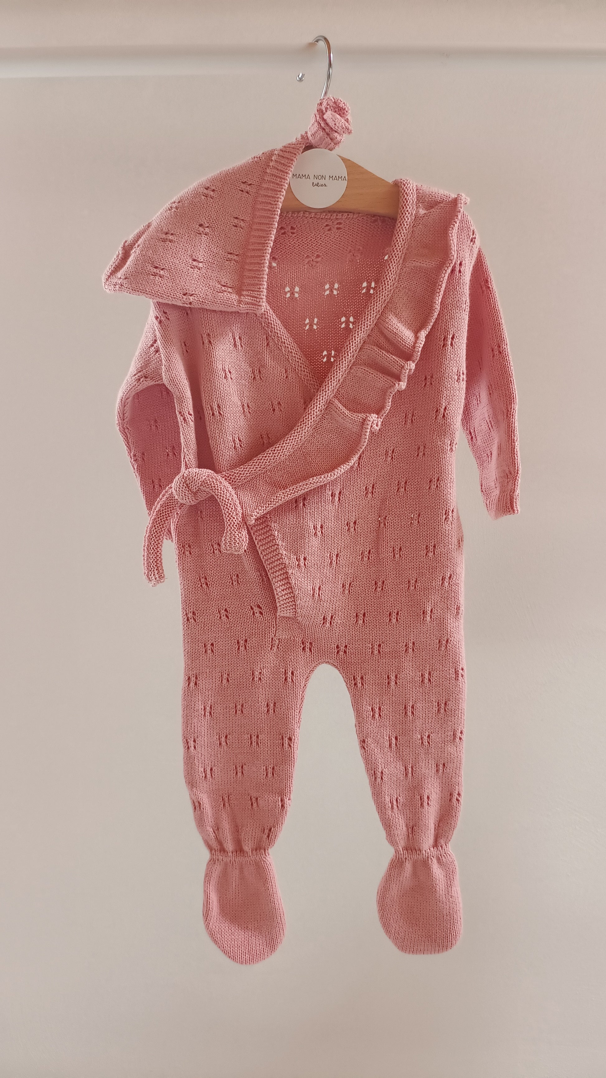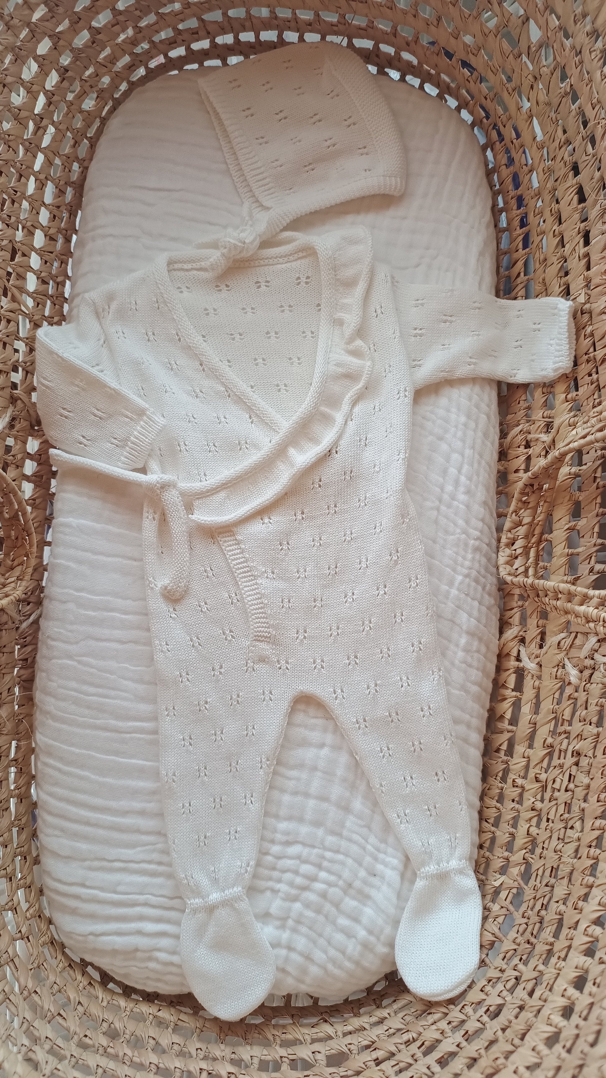 Il suo design unico, con l'innovativa apertura a portafoglio e "rouge" laterale, non solo aggiunge un tocco di eleganza ma rende anche il cambio del pannolino un gioco da ragazzi. Niente più bottoncini scomodi o cerniere ingombranti! E per completare il look, ogni tutina è accompagnata da una cuffietta coordinata, creando un outfit adorabile e armonioso.