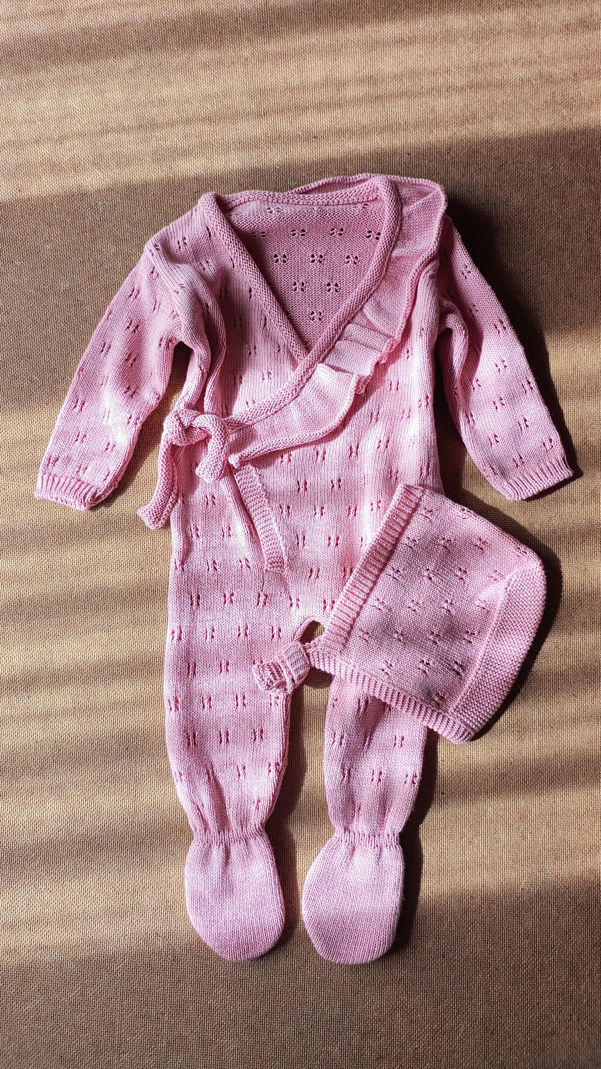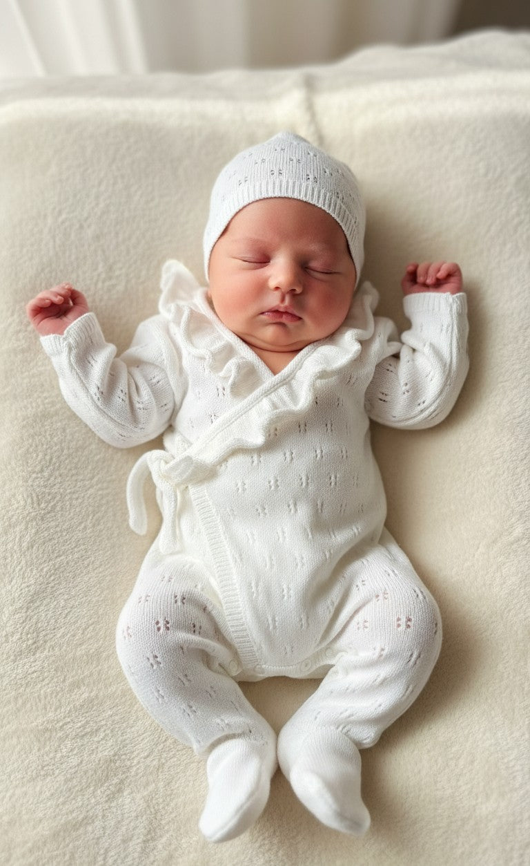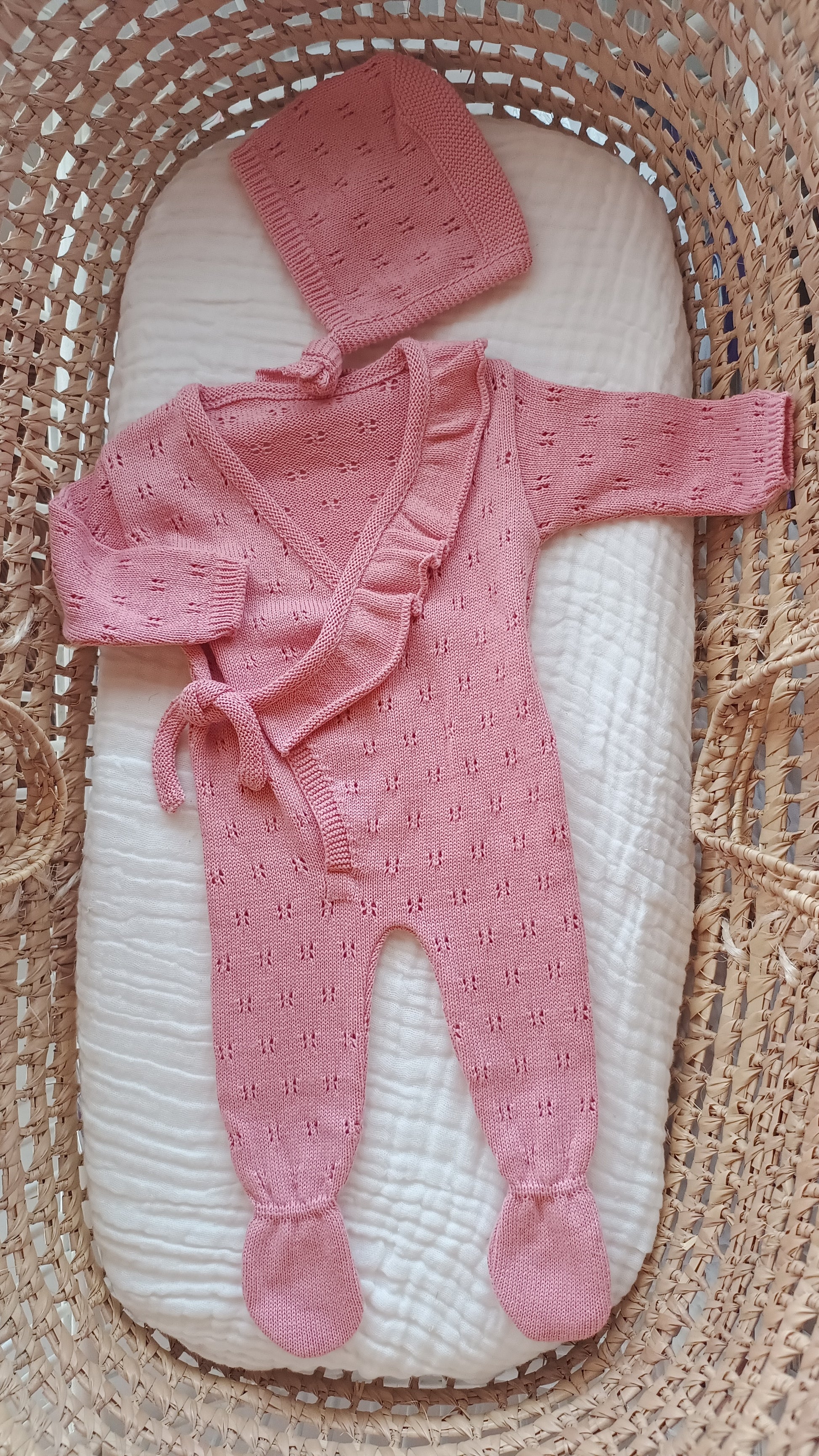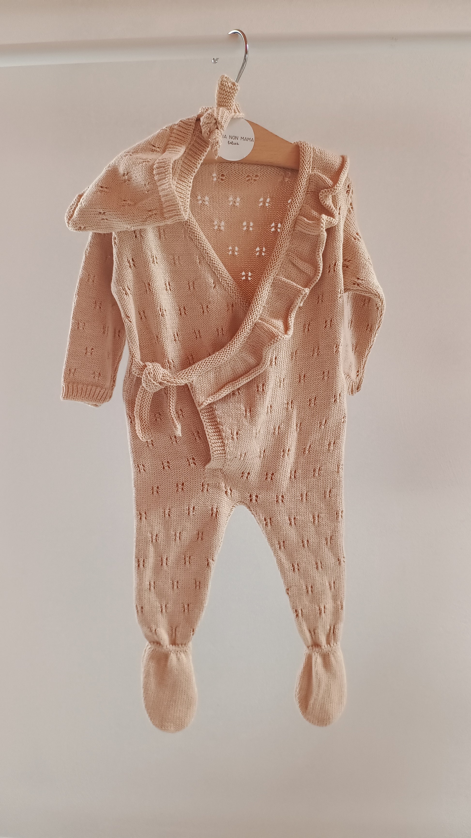 Il suo design unico, con l'innovativa apertura a portafoglio e "rouge" laterale, non solo aggiunge un tocco di eleganza ma rende anche il cambio del pannolino un gioco da ragazzi. Niente più bottoncini scomodi o cerniere ingombranti! E per completare il look, ogni tutina è accompagnata da una cuffietta coordinata, creando un outfit adorabile e armonioso.